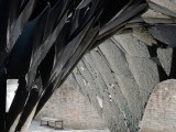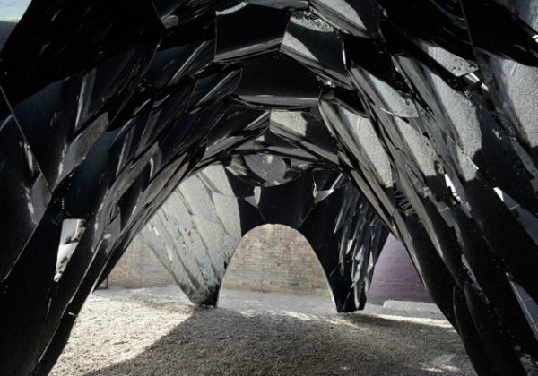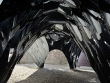 AR-MA, led in this project by one of its Directors Robert Beson, responded with this mini temporary pavilion, made of a robotically formed curved Corian exterior envelope and 152 laser-cut cylindrical black mirror-polished stainless steel interior panels.