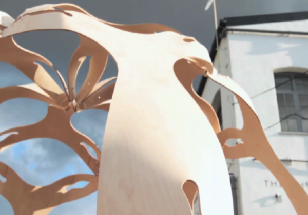 Lek decided to make a pavilion because, among other reasons, “it’s like an extra small, deluxe version of an architect’s work.” He also wanted to see whether he could apply his experiments with bending plywood to create strong, modular, free standing, three dimensional forms that could be transported and assembled with ease, and then disassembled and used for something else. He began by experimenting with symmetrical shapes found in nature and cut small, Rorschach-like patterns out of paper, combining them in a variety of formations.