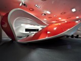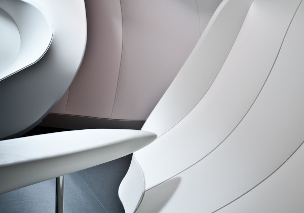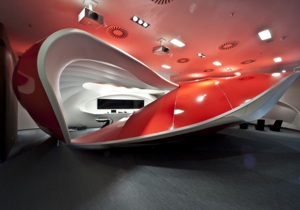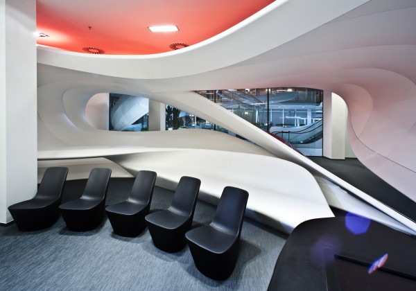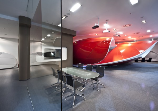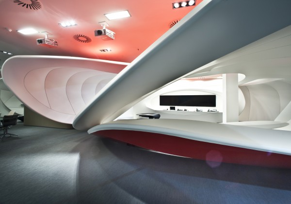 © Photographs: Alexander Doborvotský Subsequently the shape was divided into segments using aluminum moldings used for the stretching of Barrisol foil. We used the combination of red and white foil as to create Vodafon’s colour. Another atypical production process was that we had to produce our own custom made furniture. The material Corian was used for these shapes and spatially very complicated furniture. It is possible to bend Corian into many desired shapes using the termoforming technology and with a high level of experience. However, the actual implementation was preceded by careful in-deph drafting in 3D models.