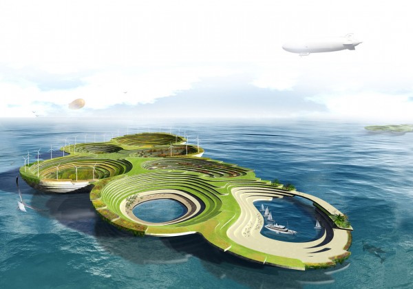 Underneath the island, great turbines attached to the bottom convert ocean currents to energy, and artificial coral coats the surfaces, encouraging the development of new ecosystems.