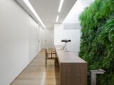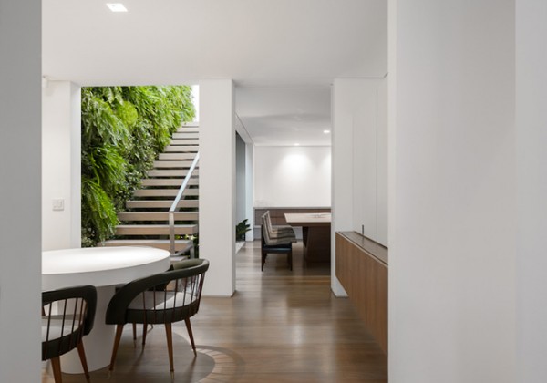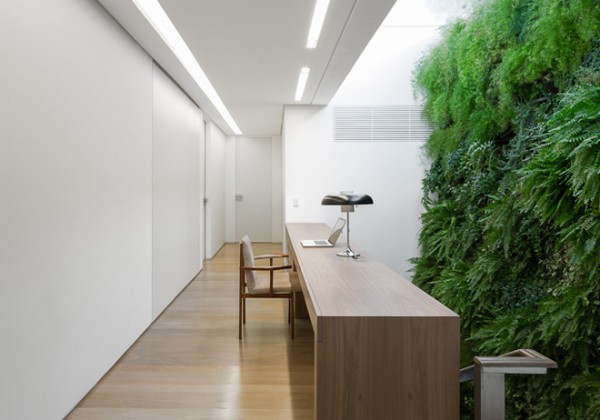 On one hand the panels filter the light and the sights; on the other hand a patio to bring light to the basement and a slit above the stairs to illuminate the vertical garden were created.