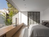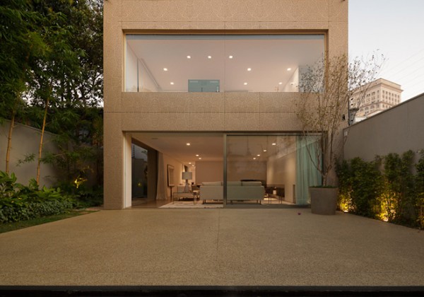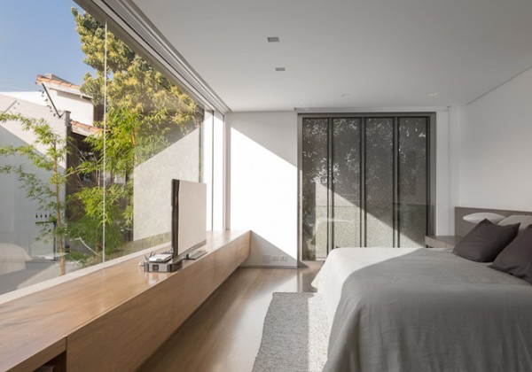 © Studio Arthur Casas The master bedroom has a generous opening towards the backyard, where the landscape creates a small oasis within the city. A water basin intensifies the sensation of openness in the garden.