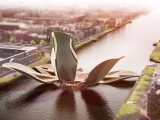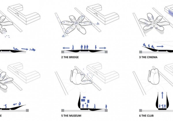 © MLBS Architects In a city that seems in a constant quest for space to host different activities it would be a pity to miss the wonderful opportunity to create a multifunctional bridge.Depending on the time of the day, the tulip blossoms unfolding its petals in different positions. In this scenario all the petals are flat out as if en révérence to Hermitage. Thus the beauty of natural form enables us to accommodate the maximum pedestrian flow and to optimize the connectivity between the banks.