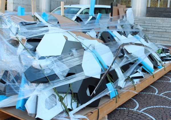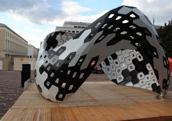 At the same time occurred for each project hypothesis also possible realization in terms of: cutting times, the material used, the assembly system.The pavilion uses about 65 square meters of Etalbond, aluminum sandwich plastic aluminum, which for its flexibility, has allowed us to realize the coupling system of the panels by simply bending the material to the inner side.