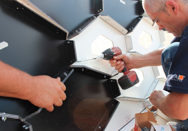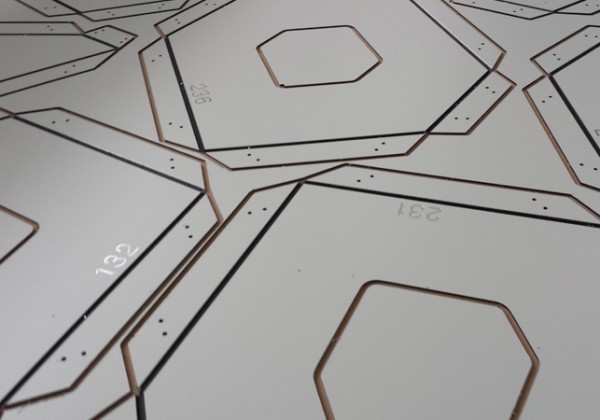 © Mediterranean FabLab + Co-de-iT + PicernoCerasoLab + Tekla In the design phase has therefore made a finned board that followed the sides of the hexagon. On each of these fins were then made 4 holes for the housing of the nuts and bolts securing the adhesion of the pieces to one another. They were used bolts and nuts type M-8, 5 diameter, length 16, equipped with washers.