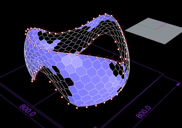 Thanks to the use of Kangaroo, the plug-in Grasshopper realized by Daniel Piker, were septate the constraint for the calculation of the planarization of all the elements, and then the final shape.