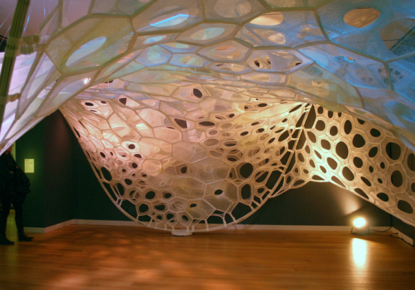 © Jenny Sabin StudioThe installation’s architectural framework is inspired by both nature and mathematics, and is built from an assemblage of mediums: digitally knitted 3D elements, solar active and drake yarns, twill tape and aluminum tubing.