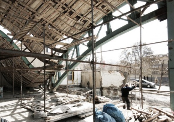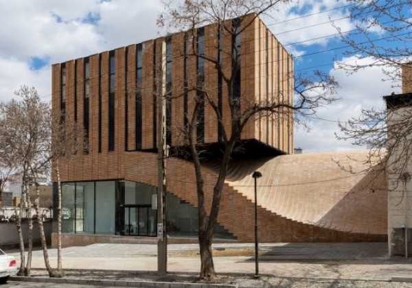 © Ahmad Bathaei and Farshad Mehdiz The traditional brick façade appears to be falling out from the ceiling slab of the ground level, and in fact tumbles out to become the functional entrance to the office space.