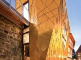 The facade is clad with golden copper metal panels of various sizes, set in a uneven pattern; this has been executed by a tinsmith, in accordance to high craftsmanship standards.The result reveals a completely foreign body, an exciting new quality, both partly rigid and partly organic among the other houses in this idyllic neighborhood.