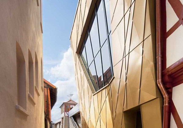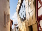 © Markus Hattwig In addition to the re-established half-timbered structure, the architects designed an expressive new wing made of concrete, consisting of assembled triangular folds.