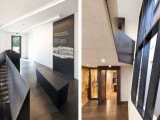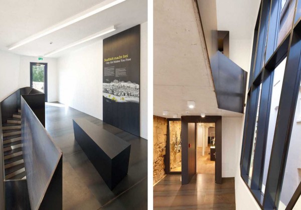 © Markus HattwigThe interior design is mainly characterized by the use of a few materials: raw steel on the floor and the balustrades, black painted wood surfaces for furniture and doors imprinted with sulphur yellow texts and pictos and exposed concrete inside the new wing, contrasting with the old stone wall.