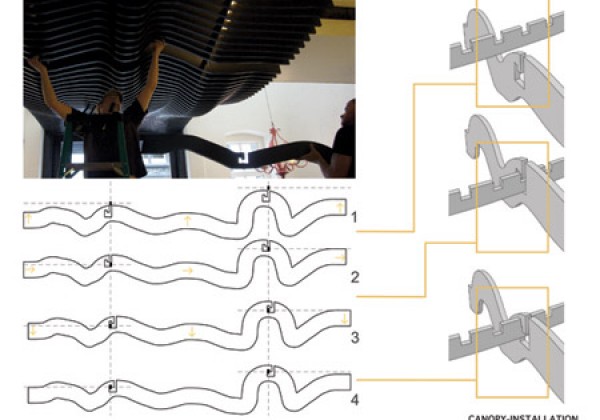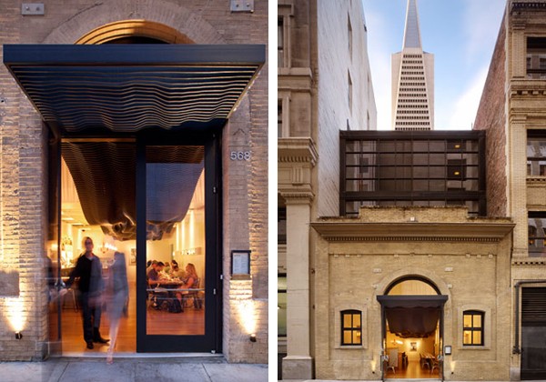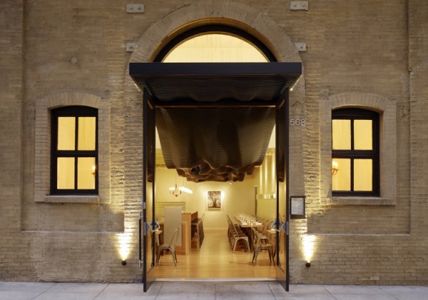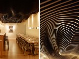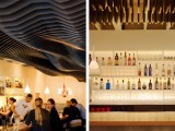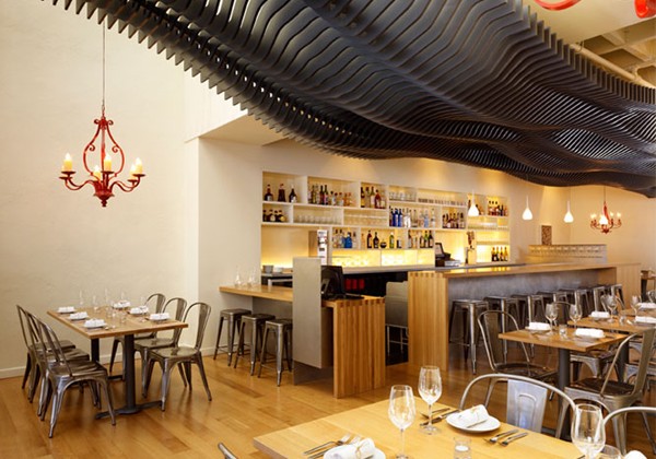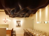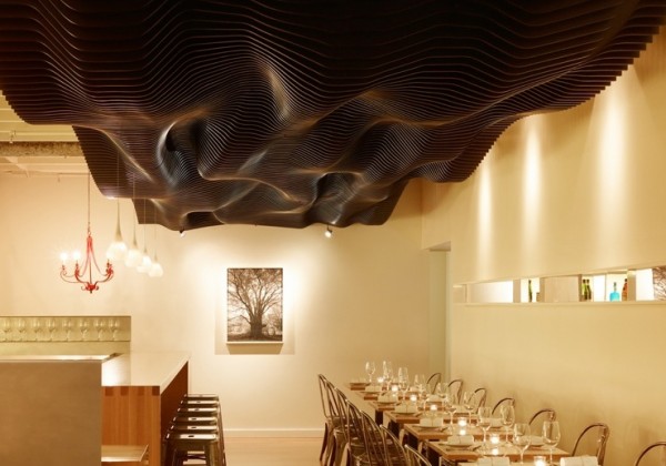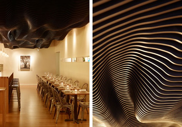 © Matthew Millman Created out of laser cut MDF and painted black, this ceiling installation billows through a refined palette of zinc and rift-sawn oak before emerging as the restaurant’s entry canopy.